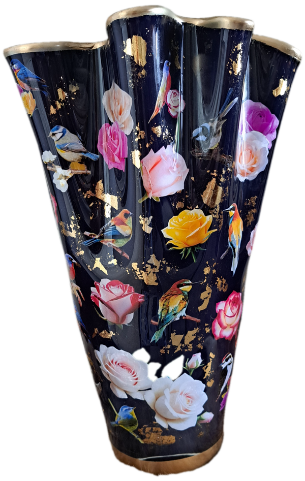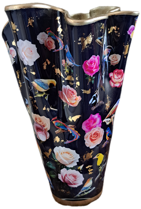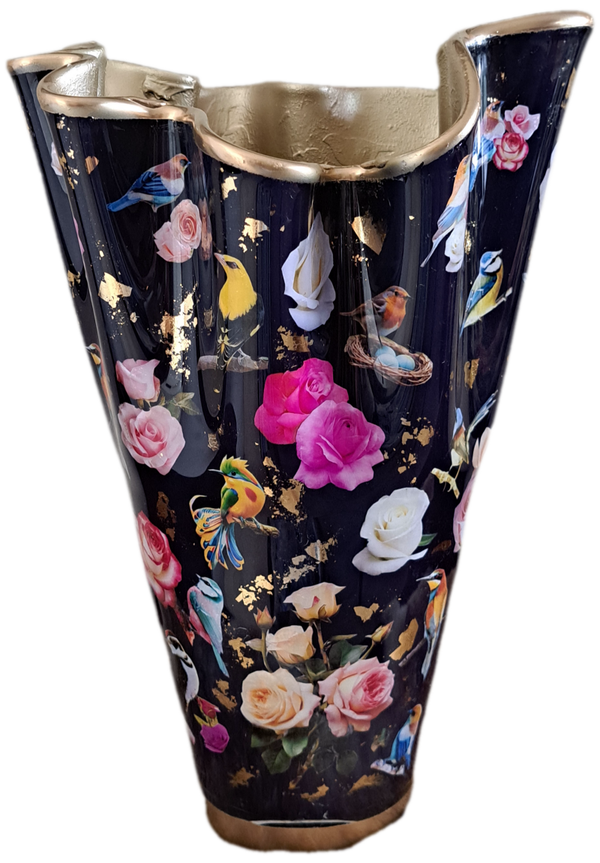 Dit is een speels en tegelijkertijd elegant sierraad voor uw interieur, gegarandeerd uniek in zijn soort. Deze indrukwekkende Grote Handgemaakte Decoupage Kartelvaas Zwart met Bloemenmotief is een kunstwerk van José, dat direct opvalt door de dynamische "Speelse Kartel" vorm en het rijke, vrolijke bloemenmotief.