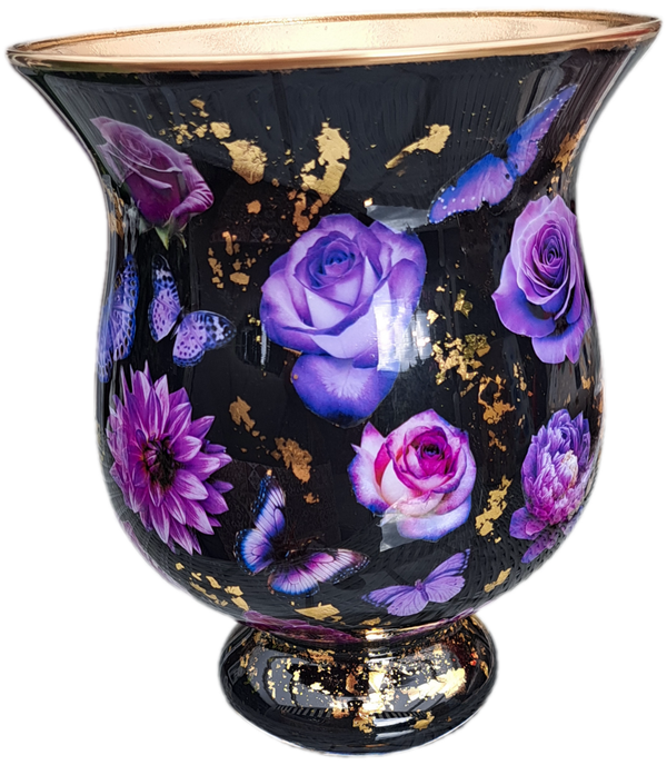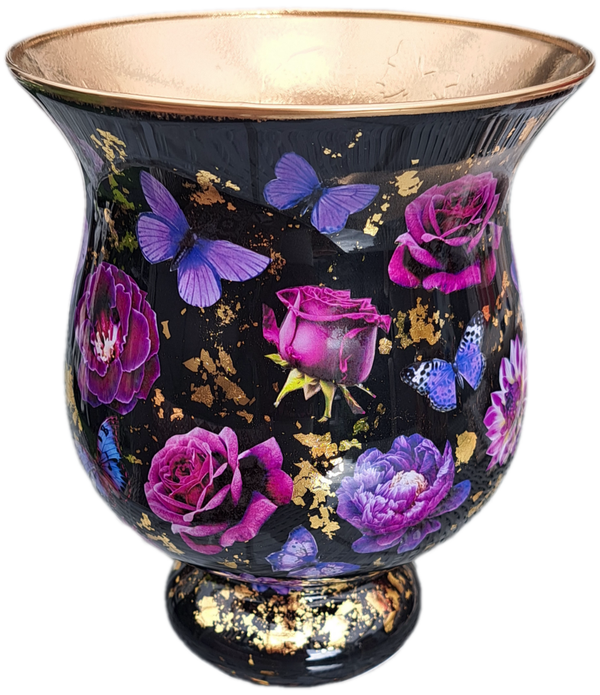 "Vaasje zwart paars bloemen handgemaakt", "Decoupage vaas 20cm"