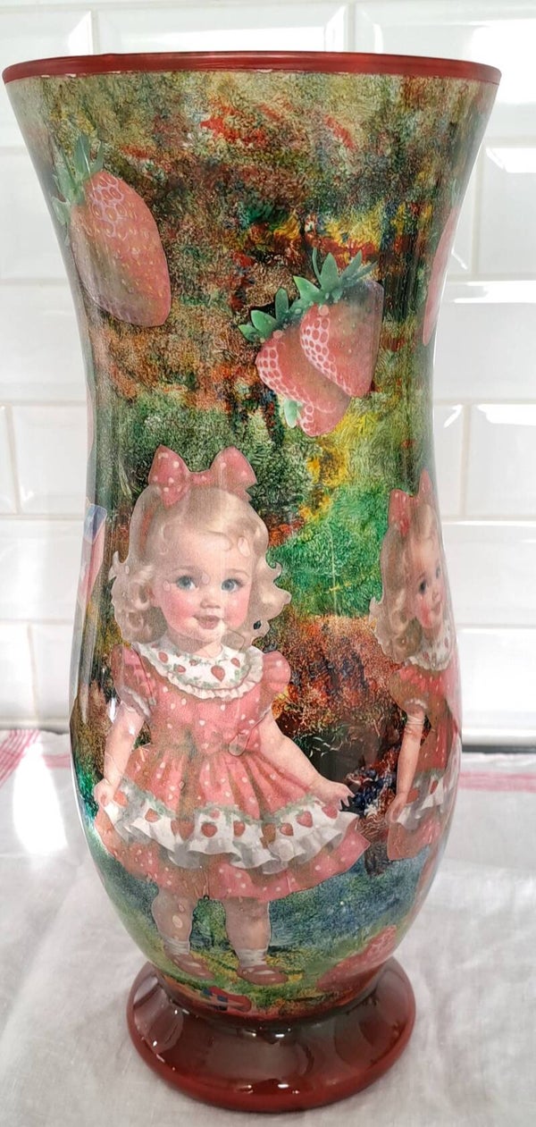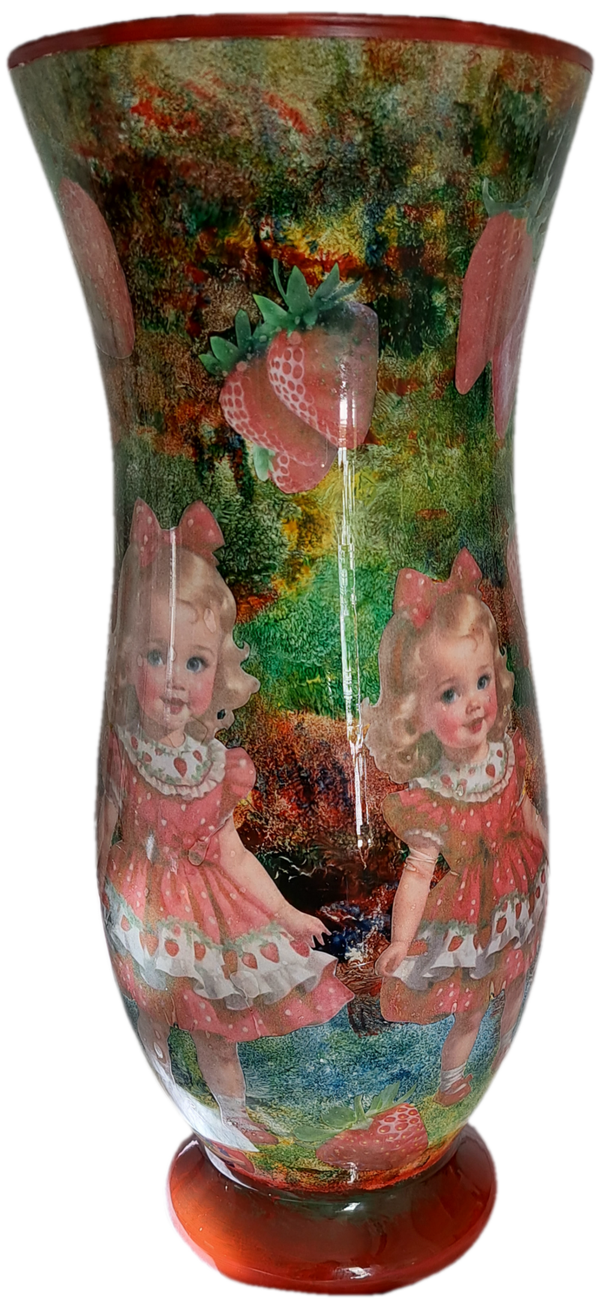 Een zeer mooie en unieke vaas met een hartverwarmend, nostalgisch thema. Deze vaas van kunstenaar José is een sieraad in huis en toont charmante afbeeldingen van kleuters/jonge kinderen. Met een hoogte van maar liefst 40cm. is het een opvallend en mooi formaat. De vaas is op unieke wijze aan de binnenkant bewerkt met decoupage-techniek, verf en vernis. Elk exemplaar is handgemaakt en uniek in zijn soort – er zijn géén twee dezelfde!