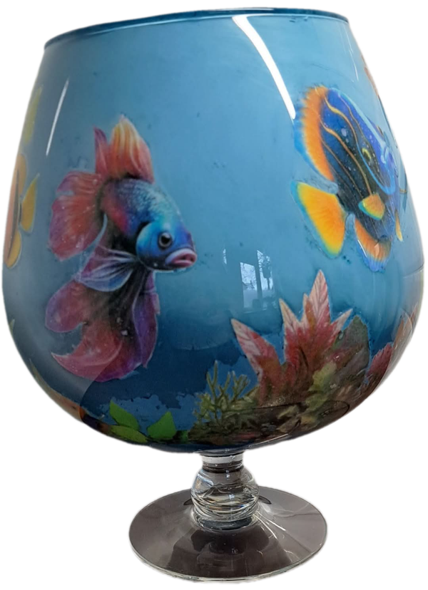 Een speels en zeer decoratief vaasje met de illusie van een vrolijke vissenkom! Dit unieke vaasje van kunstenaar José is een creatieve blikvanger die een maritieme of aquatische sfeer in huis brengt. Met een hoogte van 30cm. en 16cm. doorsnede is het een opvallend en mooi formaat. De vaas is op unieke wijze aan de binnenkant bewerkt met decoupage-techniek, verf en vernis. Elk exemplaar is handgemaakt en uniek in zijn soort – er zijn géén twee dezelfde!