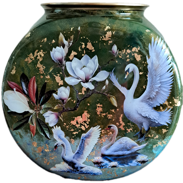 Een uniek exemplaar en gegarandeerd een blikvanger: de Elegante Ovale Vaas van José. Deze handgemaakte vaas combineert een unieke ovale vorm met een gracieus thema van zwanen. Met een hoogte van 26cm. en een diepte van 16cm. is dit een opvallend en mooi formaat. De vaas is op unieke wijze aan de binnenkant bewerkt met decoupage-techniek, verf en vernis. Elk exemplaar is handgemaakt en uniek in zijn soort – er zijn géén twee dezelfde!
