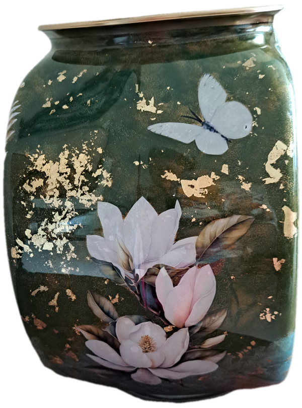 Unieke Techniek: De vaas is van binnenuit bewerkt met de decoupage-techniek, afgewerkt met verschillende laagjes verf en vernis. Dit creëert een fascinerende diepte die door het glas heen schijnt.