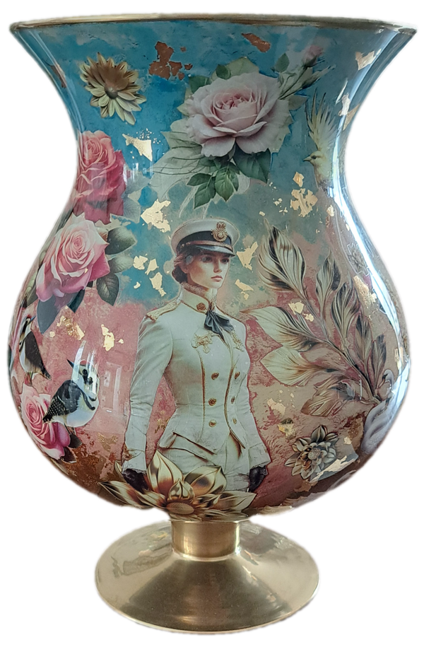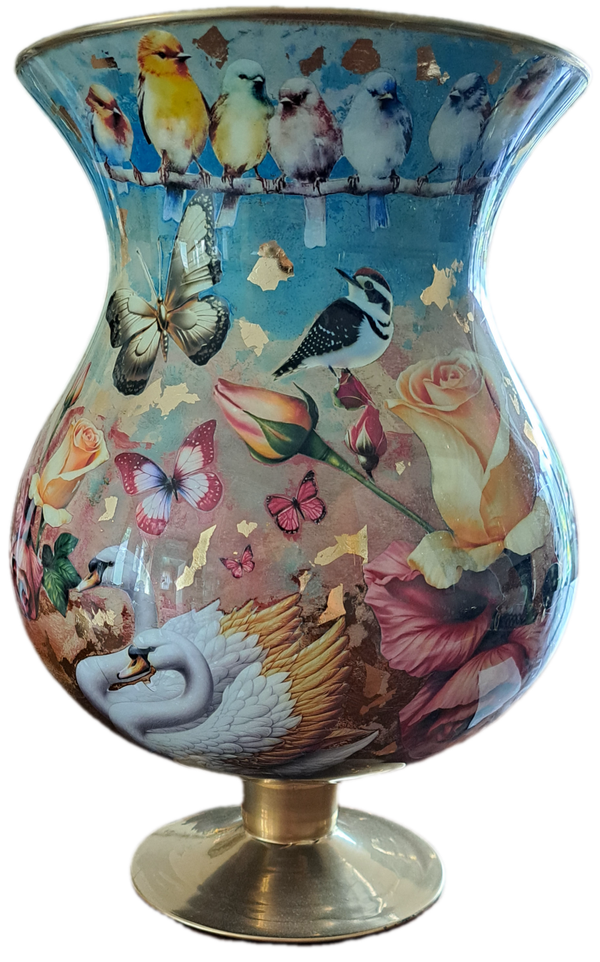 Unieke Techniek: De vaas is van binnenuit bewerkt met de decoupage-techniek, afgewerkt met verschillende laagjes verf en gevernisd. Dit creëert een fascinerende diepte en glans die door het glas heen schijnt.