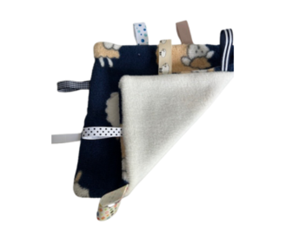 De liefste, zachtste knuffel- en troostfavoriet voor de baby. Dit schattige handgemaakte Labeldoekje combineert superzacht vlies met een vrolijke schaapjesprint. De rand is voorzien van kleurrijke labeltjes om aan te friemelen en te ontdekken, wat de fijne motoriek en zintuigen stimuleert. Met een handzaam formaat van ongeveer 20 x20cm. is dit doekje perfect om mee te knuffelen, troosten en overal mee naartoe te nemen.