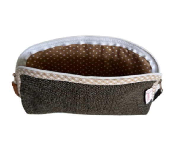 Deze handgemaakte make-up etui is een stijlvolle mix van luxe leer en sterke meubelstof. Met oog voor detail en vakmanschap vervaardigd, biedt hij een tijdloze uitstraling én functionaliteit. Het compacte formaat van 18 x 12 x 5 cm maakt hem ideaal om je favoriete make-up of kleine essentials overzichtelijk en veilig mee te nemen. Perfect voor in je handtas of op reis.