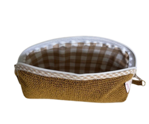Deze handgemaakte make-up etui is een stijlvolle mix van luxe leer en sterke meubelstof. Met oog voor detail en vakmanschap vervaardigd, biedt hij een tijdloze uitstraling én functionaliteit. Het compacte formaat van 18 x 12 x 5 cm maakt hem ideaal om je favoriete make-up of kleine essentials overzichtelijk en veilig mee te nemen. Perfect voor in je handtas of op reis.