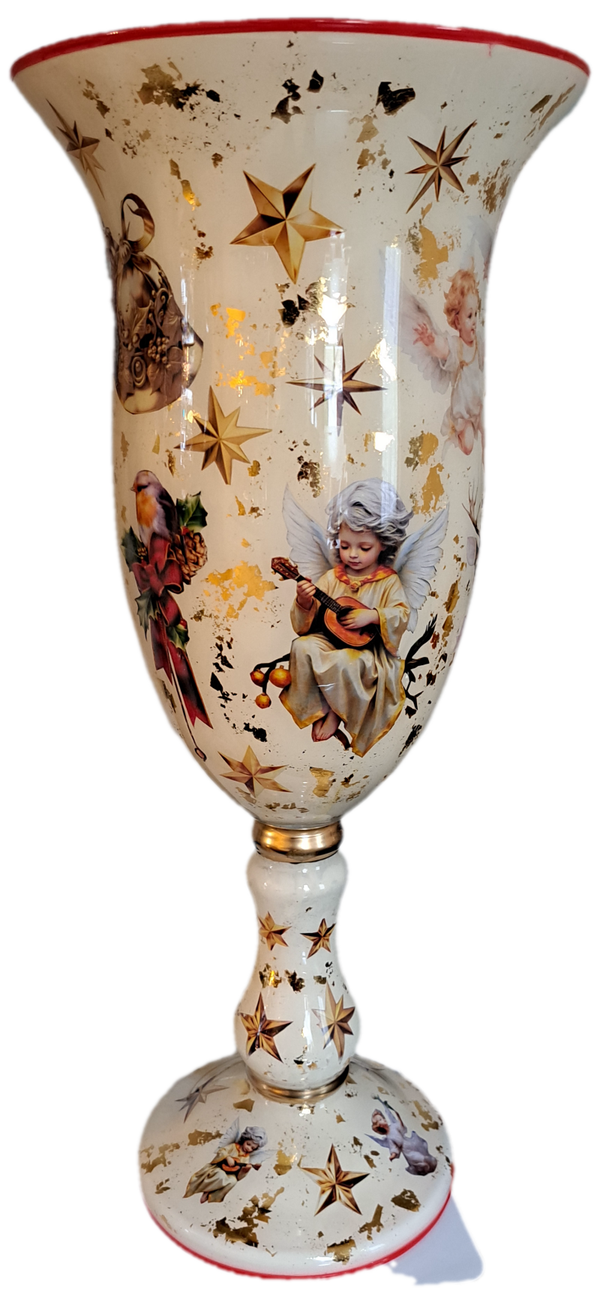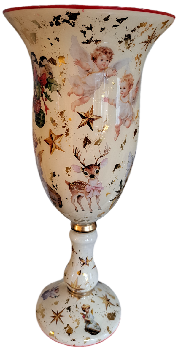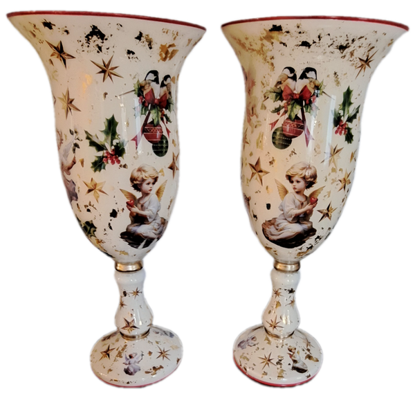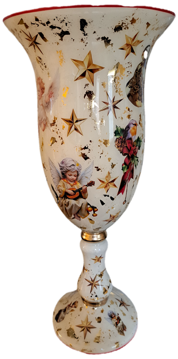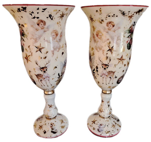 Een indrukwekkende en exclusieve set van twee vazen die gegarandeerd de ‘eyecatcher’ van uw kerstdecoratie is! Deze handgemaakte Kerst vazen van kunstenaar José zijn met een hoogte van maar liefst 55cm en een doorsnede van 25cm. een ware luxe in huis. De vazen zijn op unieke wijze aan de binnenkant bewerkt met decoupage-techniek, verf en vernis. Elk stuk in de set is handgemaakt en uniek – u zult deze stijl zeker nergens anders tegenkomen!