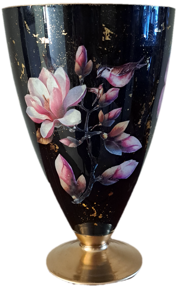 Een zeer mooie en sfeervolle vaas met een klassiek magnolia-motief. Dit pronkstuk van kunstenaar José is een elegante toevoeging aan uw interieur. De vaas is beschikbaar in chique tijdloos Zwart, prachtig gedecoreerd met magnolia's en andere verfijnde bloemen. Met een hoogte van $30cm. en 18cm. doorsnede is dit een opvallend en mooi formaat. De vaas is op unieke wijze aan de binnenkant bewerkt met decoupage-techniek, verf en vernis. Elk exemplaar is handgemaakt en uniek in zijn soort!