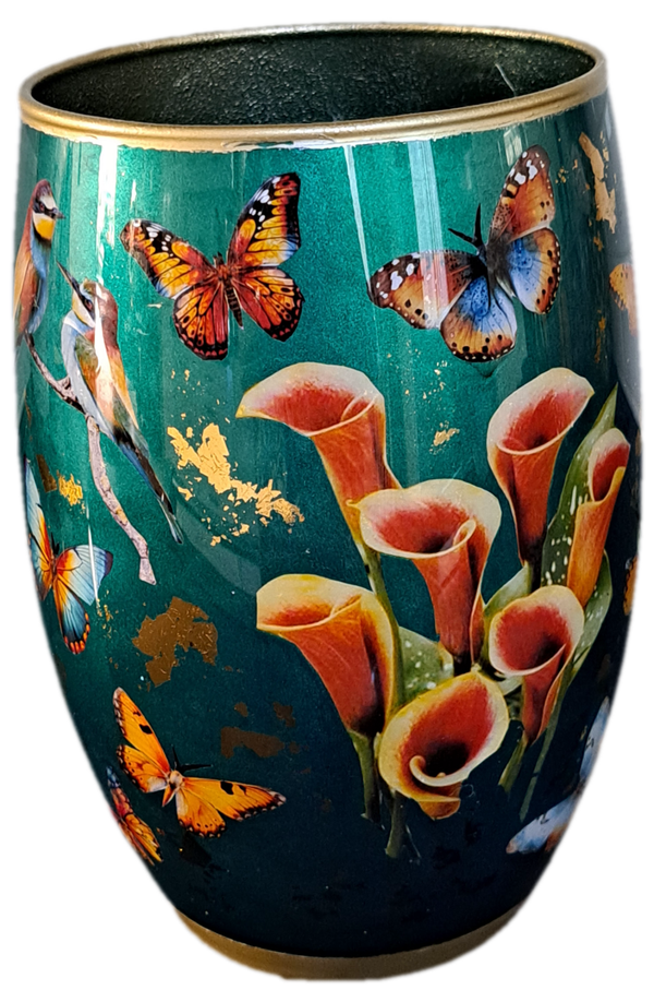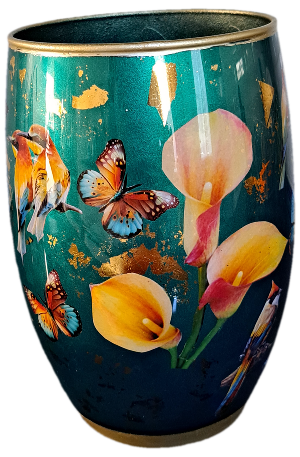 Een schitterend, handgemaakt vaasje dat elegantie uitstraalt door de unieke glans. Dit pronkstuk van kunstenaar José is uitgevoerd in een diepe groen metallic afwerking. Het is gedecoreerd met een prachtig, gedetailleerd motief van bloemen en vogels, wat een levendige en natuurlijke sfeer geeft. Dit formaat is ideaal voor een vensterbank of bijzettafel. De vaas is op unieke wijze aan de binnenkant bewerkt met decoupage-techniek, verf en vernis. Elk exemplaar is handgemaakt en uniek in zijn soort – er zijn géén twee dezelfde!