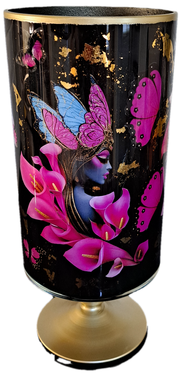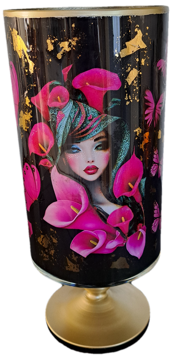 Een unieke, betaalbare vaas met een gedurfde, moderne en vrouwelijke uitstraling. Dit handgemaakte pronkstuk van kunstenaar José combineert een chique zwarte basis met luxe gouden en opvallende felroze accenten. De vaas is versierd met moderne dames en sierlijke vlinders. Met een hoogte van 30cm. en 13cm doorsnede is dit een opvallend en elegant formaat. De vaas is op unieke wijze aan de binnenkant bewerkt met decoupage-techniek, verf en vernis. Elk exemplaar is handgemaakt en uniek in zijn soort!