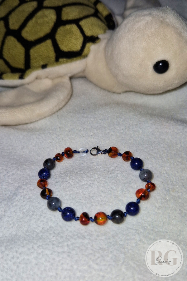 Geef jouw kindje iets unieks en liefdevols met dit handgemaakte armbandje van een krachtige combinatie: warme Barnsteen, diepblauwe Lapis Lazuli en iriserende Labradoriet. De drie stenen werken samen om een harmonieuze en beschermende energie te creëren.