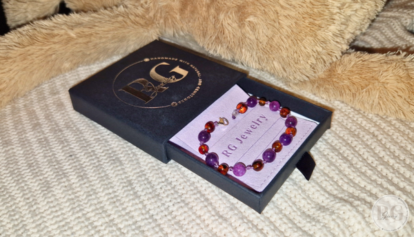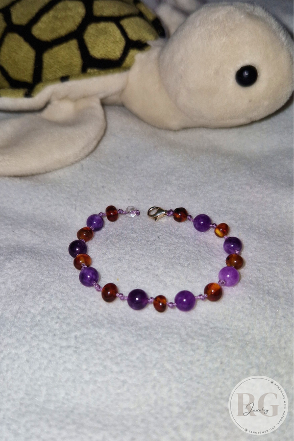 Geef jouw baby iets bijzonders met dit liefdevol handgemaakte armbandje van natuurlijke Barnsteen en prachtige, paarse Amethist. De combinatie van de warme Barnsteen- en de kalmerende Amethist-kralen zorgt voor een harmonieuze en rustgevende uitstraling.